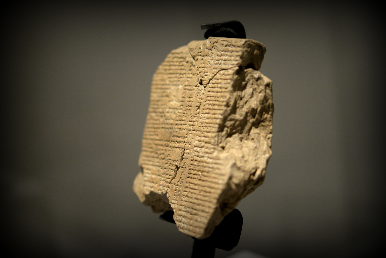 A newly discovered tablet V of the epic of Gilgamesh. The left half of the whole tablet has survived and is composed of 3 fragments. The Sulaymaniyah Museum, Iraq. Photo © Osama S.M. Amin.
